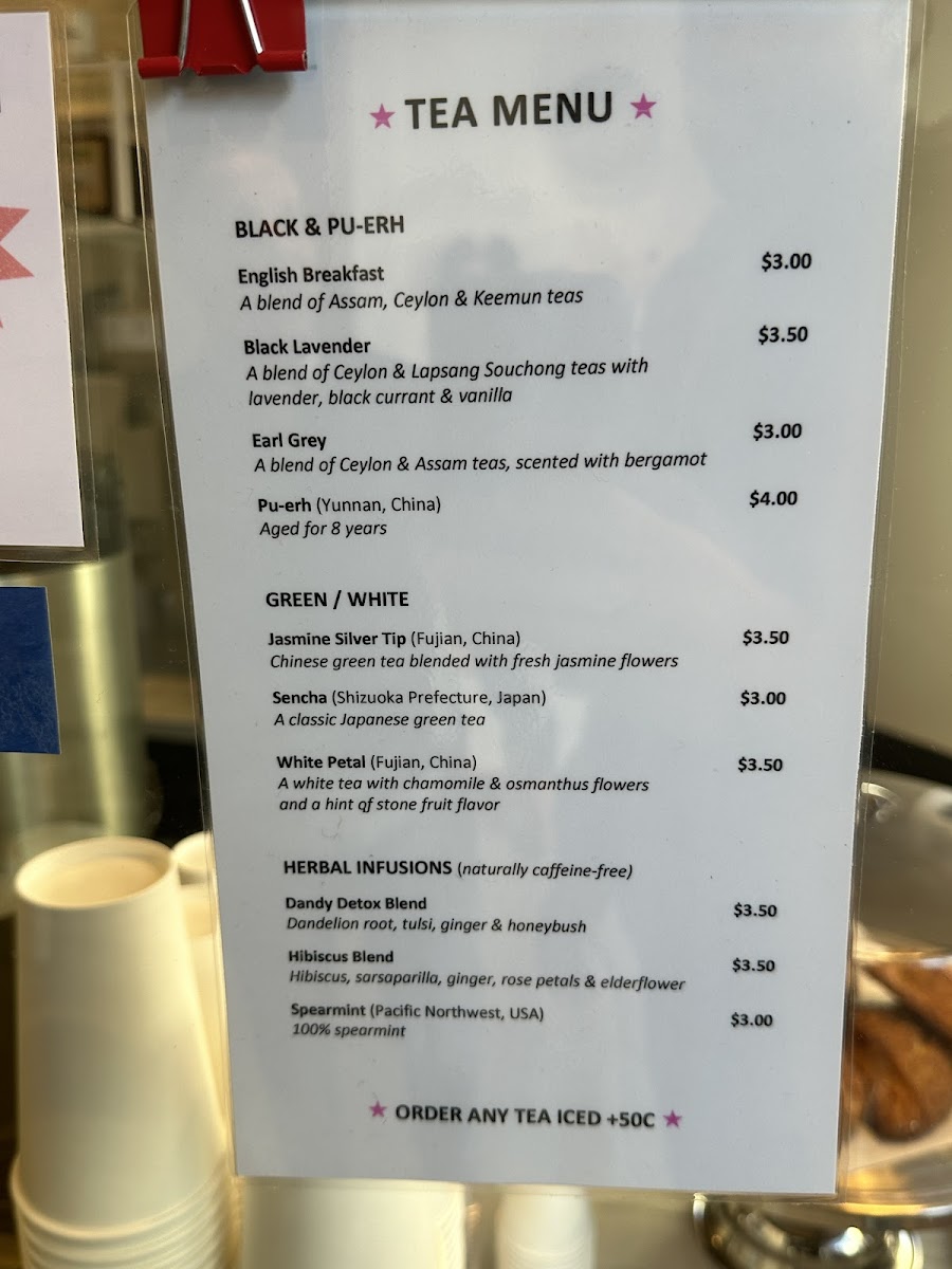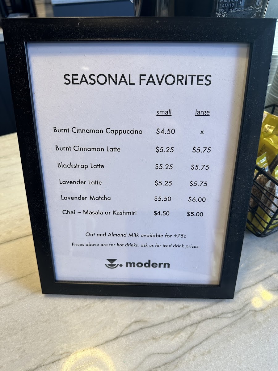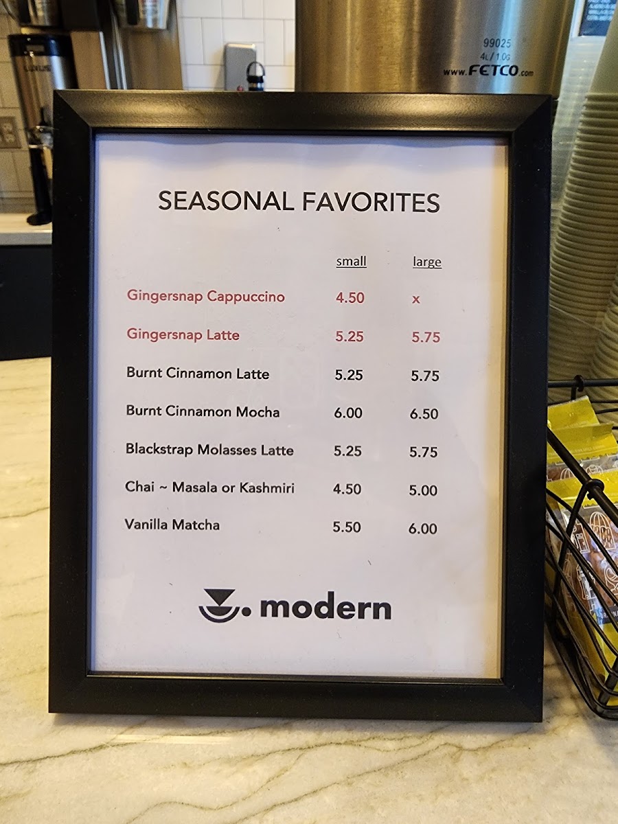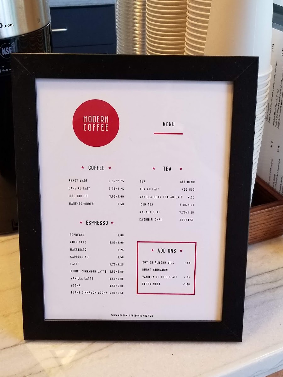 The menu at Modern Coffee in Oakland offers a delightful variety of beverages, catering to different tastes and preferences. For those with a sweet tooth, their Hot Cocoa is a classic choice. The Seasonal Favorites section features refreshing options like the Iced Strawberry Matcha, Blackstrap Iced Coffee, and Iced Lavender Latte. Coffee lovers can enjoy a range of offerings, including Ready Made Coffee, Cafe Au Lait, and the creamy Coffee W Shot Iced Coffee. For tea enthusiasts, Modern Coffee offers a diverse selection of Black & Pu-Erh teas such as English Breakfast, Black Lavender, and Earl GreyPu-Erh, as well as Green/White options like Jasmine Silver Tip and Sencha. If you're in the mood for something herbal, try the Dandy Detox Blend, Hibiscus Blend, or Spearmint infusions. The menu also includes other classics like Masala Chai, Kashmiri Chai, and the indulgent Vanilla Bean Tea Au Lait. Whether you're after a hot drink or a cool iced beverage, the wide array of choices promises to satisfy any craving.